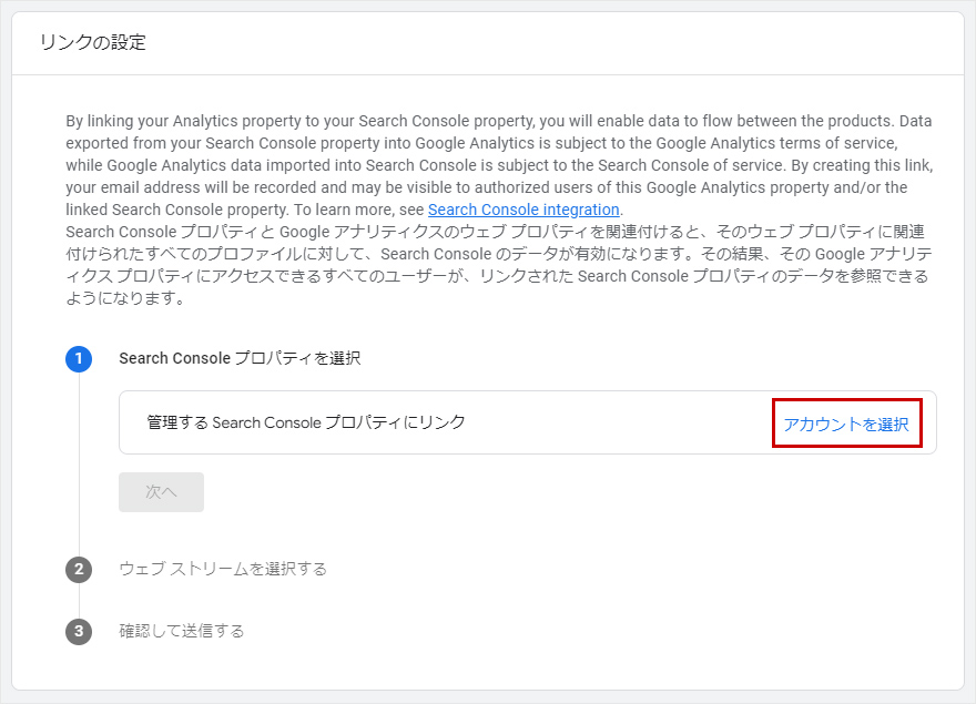 Search Consoleとのリンクを作成する画面に戻り、「(1)Search Console プロパティ選択」の[次へ]をクリックし、「(2)ウェブストリームを選択する」の[選択]をクリックします。