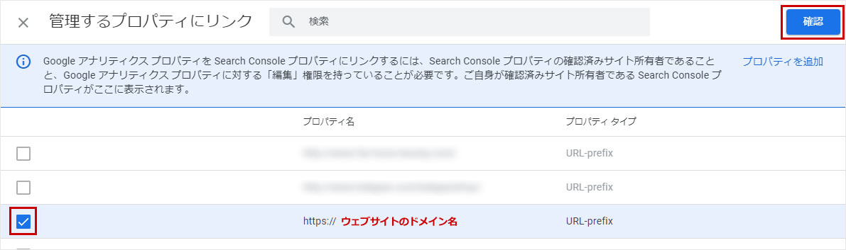 管理するプロパティにリンク画面で該当のプロパティ名のチェックボックスを選択し、右上の[確認]をクリックします。