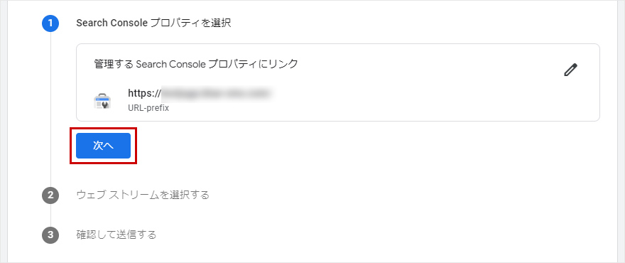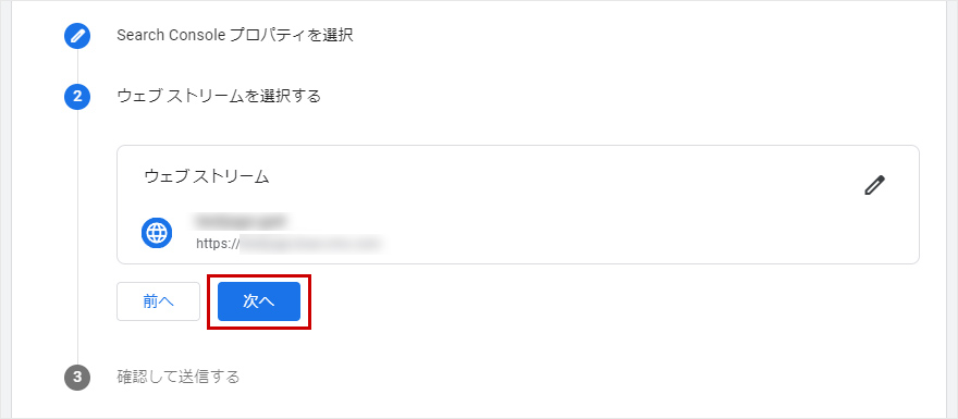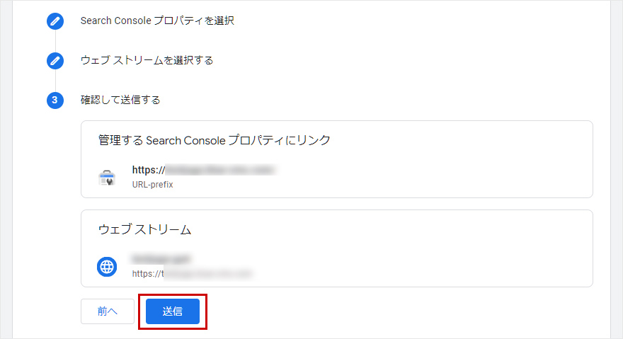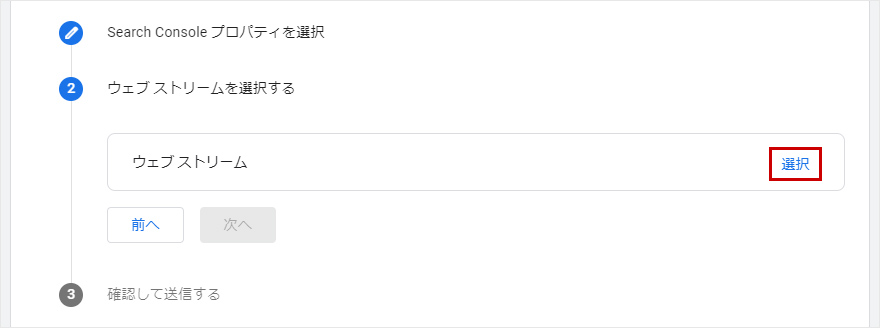 Search Consoleとのリンクを作成する画面に戻り、「(2)ウェブストリームを選択する」の[次へ]をクリックし、「(3)確認して送信する」の内容を確認して[送信]をクリックします。