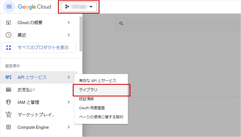 Google Cloud Platformが表示されますので、[プロジェクトの選択]をクリックして、下記の「Google Analytics連携を設定する【GA4】」の手順で作成したプロジェクトを選択します。次に、ナビゲーションメニューの[APIとサービス] → [ライブラリ]を選択します。