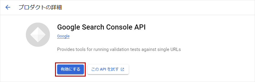 APIライブラリ画面が表示されたら検索フォームに「Search Console」を入力し、『Google Search Console API』をクリック後、次のページで[有効にする]をクリックします。