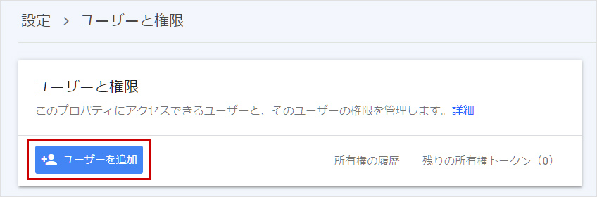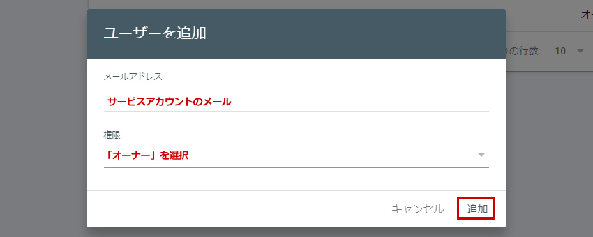 ユーザーと権限画面の[ユーザーを追加]をクリックし、「ユーザーを追加」の「メールアドレス」には、下記の「Googleアナリティクス連携を設定する【GA4】」の手順で作成したサービスアカウントの「メール」を入力します。「権限」は「オーナー」を選択して「追加」をクリックします。