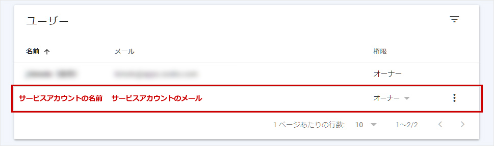 ユーザーと権限画面の「ユーザー」に追加したサービスアカウントが表示されたら連携設定は完了です。