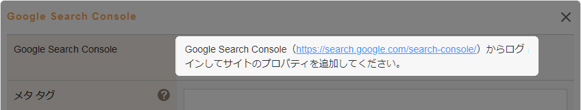 Google Search Consoleの画面はそのままにCMSの編集画面に戻り、“Google Search Consoleダイアログ”の《メタ タグ》に、先ほどコピーしたメタタグをペーストして、その他の項目を設定します。