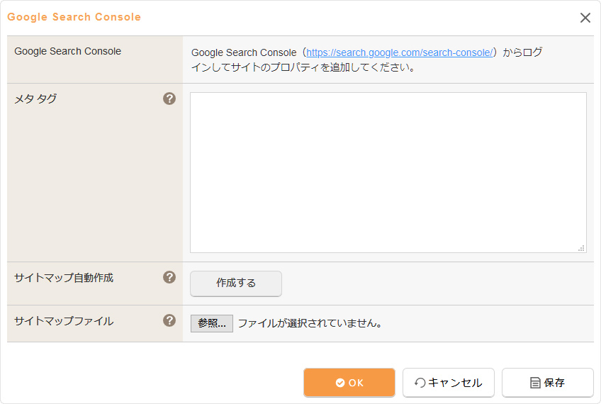 | メタタグ | Google Search Consoleで発行されたメタタグを入力します。 |
